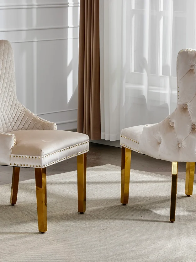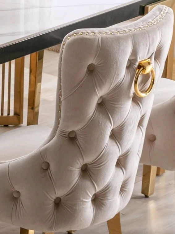 Creme Velvet Dining Chair with Large Knocker, Polished Gold Frame, Deep Tufting back and Nail Head Details.